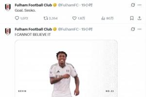 然而在富勒姆发布进球赛讯仅一分钟后,曼联随即依靠舍什科的进球再度领先,富勒姆官推的狂欢瞬间化为沉寂。