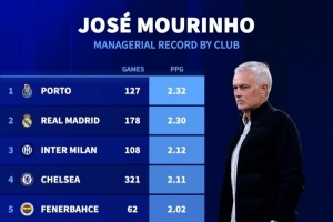 德国转会市场统计了穆里尼奥执教生涯至今在不同球队的场均积分,并列出榜单,波尔图2.32分居首,皇马2.3分次席。