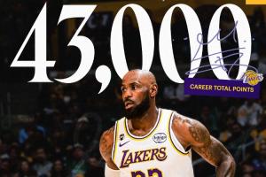 截至发稿时,詹姆斯已经得到16分,NBA生涯常规赛总得分突破43000大关,成为史上首位43000分先生。