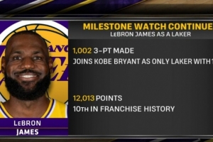 本场比赛,湖人球星詹姆斯命中4记三分球,他在湖人队已经命中1002记三分球,成为队史继科比之后第二位命中1000+三分球的球员。