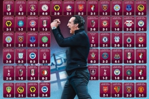 维拉在官方社交媒体上晒出埃梅里带队赢下100场胜利的海报,并列出了这100场比赛具体的对手和比分。