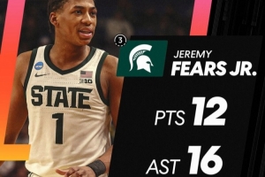 体育资讯3月22日讯 今日NCAA疯三32强赛,密歇根州立大学77-69拿下路易斯维尔。