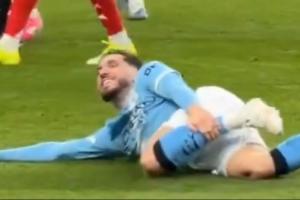 倒地后的谢尔基捂着腿非常痛苦,但突然停住动作看向场边,脸上露出微笑的神情,随后继续转身捂腿。