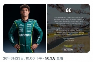 体育资讯3月24日讯 阿斯顿·马丁车队宣布,车队的三号车手杰克·克劳福德将顶替阿隆索,出席日本大奖赛的一练。届时他将驾驶阿隆索的赛车。