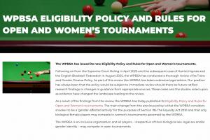 世界职业台球和斯诺克协会始终秉持包容开放的组织理念,所有选手——无论其生理性别、法定性别及性别认同如何——均可参与公开组赛事的角逐。
