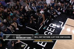 下半场开始时马刺官方宣布文班左肋骨挫伤,下半场提前退赛。
